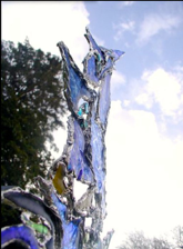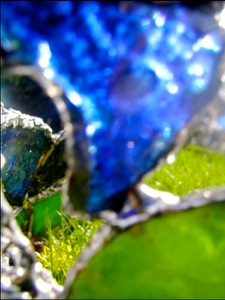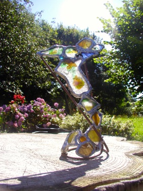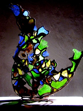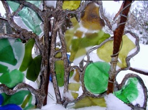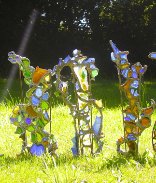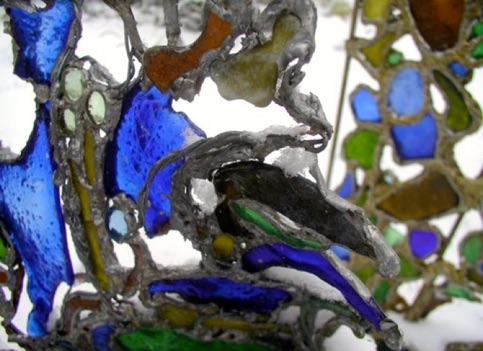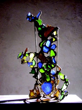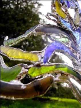 Espirales de energía transparente cristalizadas con vidrios reciclados de color unidos por hilos de hierro y de plomo.