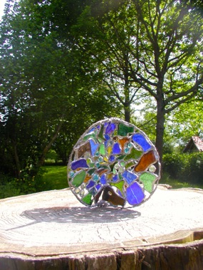 Artesanos y ecológicos ... están hechos de botellas recicladas ... rotas por choque térmico, las son entonces recicladas, dándole vida a las baldosas de vidrio ... Hago cada obra de arte con las nuevas piezas, cuidadosamente escogidas, siempre en busca de transparencias ... texturas ... profundidades ... en un descubrimiento perpetuo donde la alianza del fuego es siempre inesperada y sorprendente ... para crear ambientes que favorezcan los sueños ...