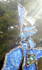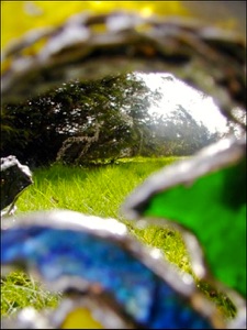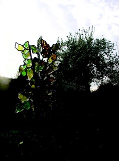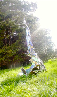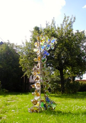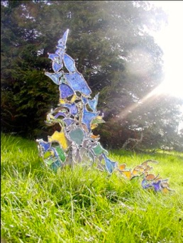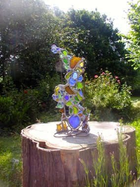 Soy apasionada de vitrales de color ... Voy a contemplar a menudo los módulos de los vitrales de colores en las abadías ... iglesias y catedrales de la Edad Media ... También me encantan los vidrios y y las botellas de vidrio de color ... Un día, estaba en la iglesia de Conches Ouche, en Normandía (Francia), contemplando sus hermosos módulos de vitrales del siglo XII, y para mi asombro, me lamentaba de no poder acercarme más cerca ... No ser capaz de tocarlos... No ser capaz de recrear esa atmósfera mágica de esos módulos de vitrales de colores en mi casa ya que necesitaria una vidriera ... Entonces pensé en mi gran colección de botellas de vidrio, que se estaba poniendo omnipresente en ese momento, y me decidí a reciclarlas, comencé a crear mis propias baldosas de vidrio, esculturas y módulos de vidrios de colores cuyos contacto y manipulación son menos restrictivos ... Mis ideas fluyeron rápidamente en el diseño ... La estructura de árboles con sus hojas translúcidas ... liviana ... abierta para ilustrar mi deseo de crear espacios llenos y vacíos donde la fluidez dinámica de la vida es una prioridad ... Empece mi trabajo de creación en mi taller poniendo en práctica todas estas ideas ... Desde entonces, mi búsqueda artística fluye en esta dirección, donde la alquimia ... las metamorfosis de los materiales, la alianza del fuego ... del agua ... del aire ... de la Tierra ... de los metales es un cuento de nunca acabar ... Ahora recupero las botellas tiradas en llas aceras ... en los jardines ... en los lugares públicos para reciclarlas en gotas de sueños despierto ...