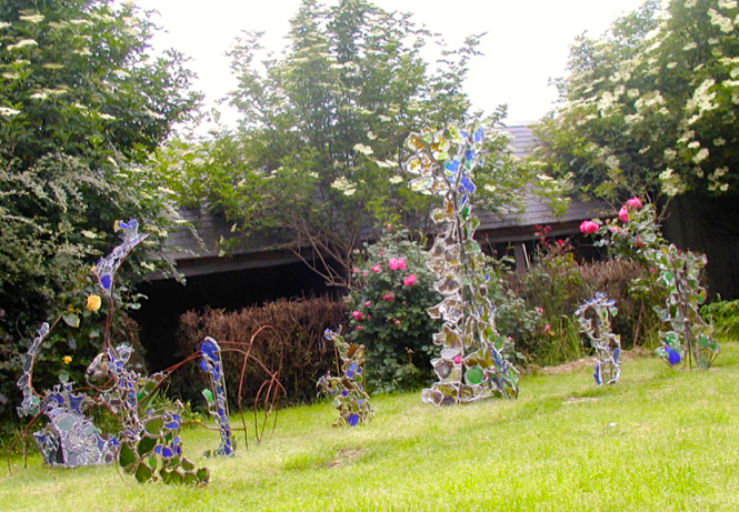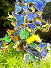 Orgánicas en estructura, estas obras de arte tridimensionales están hechas de espirales de energía transparente cristalizadas en baldosas de vidrios de color reciclados, soldadas entre sí con hilos de hierro y de plomo.