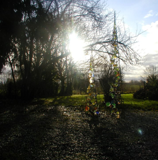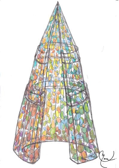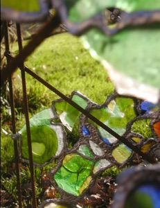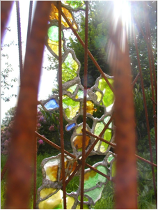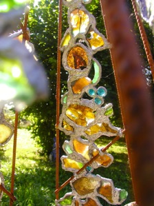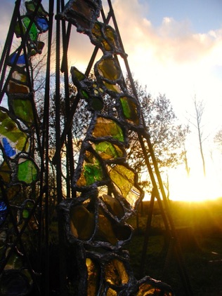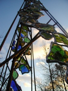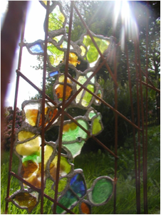 Espirales de energía transparente cristalizadas con vidrios reciclados de color unidos por hilos de hierro y de plomo.