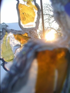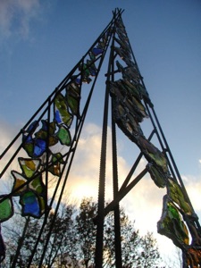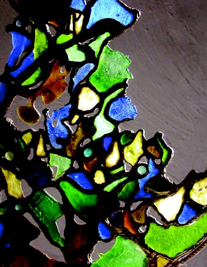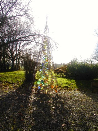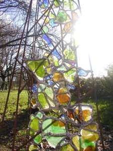 Spirales d'énergie transparente cristallisée par des verres colorés reliés par des fils de fer et de plomb.