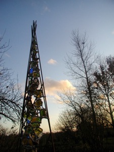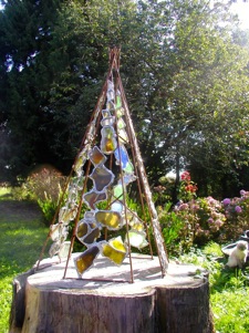 Je suis passionnée des vitraux ... Je vais souvent les contempler dans les abbayes ... églises ou cathédrales du Moyen-âge ... J'aime également les verres et les bouteilles en verre colorées ... Un jour je me trouvais à l'église de Conches en Ouche, Normandie, à contempler leurs magnifiques vitraux du XXII ème siècle et, dans mon émerveillement, je regrettais le fait de ne pas pouvoir m'approcher davantage ... De ne pouvoir les toucher ... De ne pas pouvoir récréer chez moi cette atmosphère magique sous ces verres colorés puisqu’il faudrait des verrières pour le faire ... Alors je pensais à ma grande collection de bouteilles en verre qui devenait envahissante et je décidais leur recyclage afin de créer mes dalles de verre et construire ainsi des sculptures en vitraux dont le contact et la manipulation sont moins contraignants ... Ma réflexion s’est vite envolée vers la conception ... La structure des arbres avec leur feuillage translucide ... légers ... ouverts a illustré mon désir de créer des espaces pleins et vides où la fluidité dynamique de la vie est une priorité ... Je suis alors repartie dans l'atelier mettre en place toutes ces idées ... Depuis lors ma recherche plastique va dans cette direction où l'alchimie ... les métaorphoses des matières l'alliage du feu ... de l'eau ... de l’air ... de la terre ... des métaux est une histoire sans fin ... Maintenant je récupère des bouteilles jetées sur les trottoirs ... dans les jardins ... places publiques pour les recycler...
