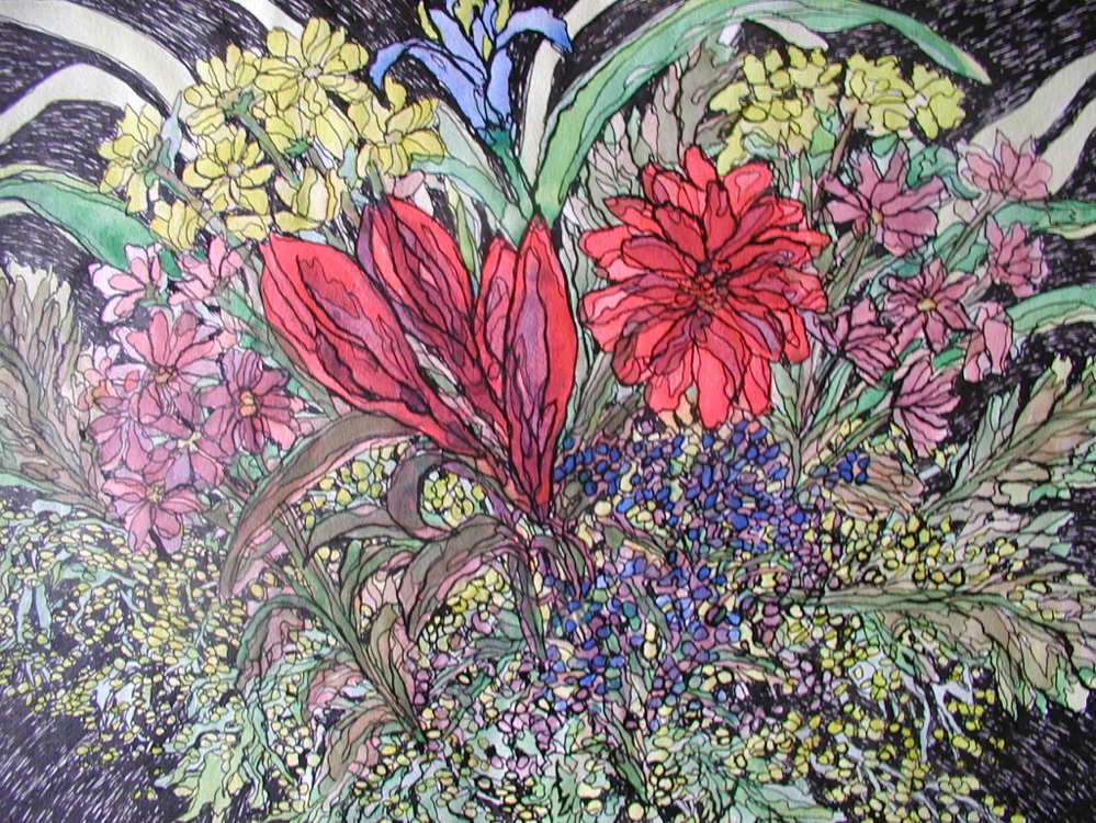 Série d'Aquarelles ~ Paneau No.1 “Jardin de Fleurs multicolore”