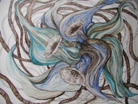 Organic in structure, this three dimensional art piece is made of spirals of transparent energy crystallized by recycled colored glass soldered together with iron and lead threads.