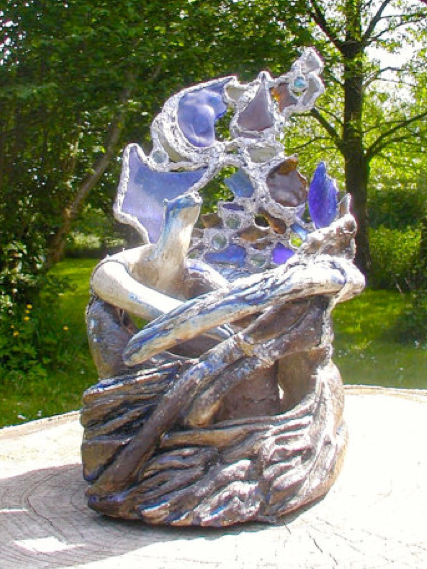 Strates de terres, faïences, porcelaines... modelées dans la souplesse et la légèreté féline. Spirales d'énergie transparente cristallisée par des verres colorés reliés par des fils de fer et de plomb.