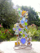 Je suis passionnée des vitraux ... Je vais souvent les contempler dans les abbayes ... églises ou cathédrales du Moyen-âge ... J'aime également les verres et les bouteilles en verre colorées ... Un jour je me trouvais à l'église de Conches en Ouche, Normandie, à contempler leurs magnifiques vitraux du XXII ème siècle et, dans mon émerveillement, je regrettais le fait de ne pas pouvoir m'approcher davantage ... De ne pouvoir les toucher ... De ne pas pouvoir récréer chez moi cette atmosphère magique sous ces verres colorés puisqu’il faudrait des verrières pour le faire ... Alors je pensais à ma grande collection de bouteilles en verre qui devenait envahissante et je décidais leur recyclage afin de créer mes dalles de verre et construire ainsi des sculptures en vitraux dont le contact et la manipulation sont moins contraignants ... Ma réflexion s’est vite envolée vers la conception ... La structure des arbres avec leur feuillage translucide ... légers ... ouverts a illustré mon désir de créer des espaces pleins et vides où la fluidité dynamique de la vie est une priorité ... Je suis alors repartie dans l'atelier mettre en place toutes ces idées ... Depuis lors ma recherche plastique va dans cette direction où l'alchimie ... les métaorphoses des matières l'alliage du feu ... de l'eau ... de l’air ... de la terre ... des métaux est une histoire sans fin ... Maintenant je récupère des bouteilles jetées sur les trottoirs ... dans les jardins ... places publiques pour les recycler...