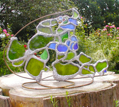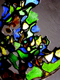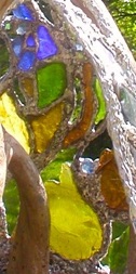 Je suis passionnée des vitraux ... Je vais souvent les contempler dans les abbayes ... églises ou cathédrales du Moyen-âge ... J'aime également les verres et les bouteilles en verre colorées ... Un jour je me trouvais à l'église de Conches en Ouche, Normandie, à contempler leurs magnifiques vitraux du XXII ème siècle et, dans mon émerveillement, je regrettais le fait de ne pas pouvoir m'approcher davantage ... De ne pouvoir les toucher ... De ne pas pouvoir récréer chez moi cette atmosphère magique sous ces verres colorés puisqu’il faudrait des verrières pour le faire ... Alors je pensais à ma grande collection de bouteilles en verre qui devenait envahissante et je décidais leur recyclage afin de créer mes dalles de verre et construire ainsi des sculptures en vitraux dont le contact et la manipulation sont moins contraignants ... Ma réflexion s’est vite envolée vers la conception ... La structure des arbres avec leur feuillage translucide ... légers ... ouverts a illustré mon désir de créer des espaces pleins et vides où la fluidité dynamique de la vie est une priorité ... Je suis alors repartie dans l'atelier mettre en place toutes ces idées ... Depuis lors ma recherche plastique va dans cette direction où l'alchimie ... les métaorphoses des matières l'alliage du feu ... de l'eau ... de l’air ... de la terre ... des métaux est une histoire sans fin ... Maintenant je récupère des bouteilles jetées sur les trottoirs ... dans les jardins ... places publiques pour les recycler...
