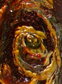 Organique en structure, cette oeuvre d'art tridimensionnelle est fabriquée de spirales d'énergie transparente cristallisée par des verres colorés, recyclés, reliés par des fils de fer et de plomb.