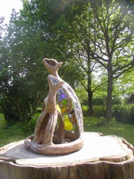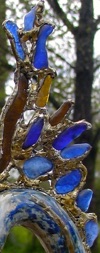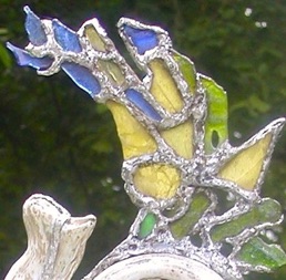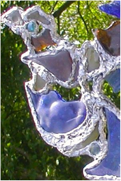 Je suis passionnée des vitraux ... Je vais souvent les contempler dans les abbayes ... églises ou cathédrales du Moyen-âge ... J'aime également les verres et les bouteilles en verre colorées ... Un jour je me trouvais à l'église de Conches en Ouche, Normandie, à contempler leurs magnifiques vitraux du XXII ème siècle et, dans mon émerveillement, je regrettais le fait de ne pas pouvoir m'approcher davantage ... De ne pouvoir les toucher ... De ne pas pouvoir récréer chez moi cette atmosphère magique sous ces verres colorés puisqu’il faudrait des verrières pour le faire ... Alors je pensais à ma grande collection de bouteilles en verre qui devenait envahissante et je décidais leur recyclage afin de créer mes dalles de verre et construire ainsi des sculptures en vitraux dont le contact et la manipulation sont moins contraignants ... Ma réflexion s’est vite envolée vers la conception ... La structure des arbres avec leur feuillage translucide ... légers ... ouverts a illustré mon désir de créer des espaces pleins et vides où la fluidité dynamique de la vie est une priorité ... Je suis alors repartie dans l'atelier mettre en place toutes ces idées ... Depuis lors ma recherche plastique va dans cette direction où l'alchimie ... les métaorphoses des matières l'alliage du feu ... de l'eau ... de l’air ... de la terre ... des métaux est une histoire sans fin ... Maintenant je récupère des bouteilles jetées sur les trottoirs ... dans les jardins ... places publiques pour les recycler...