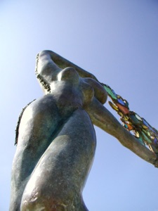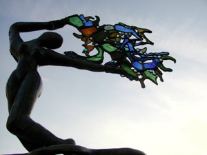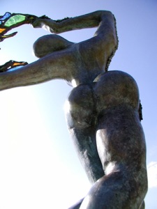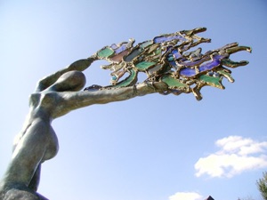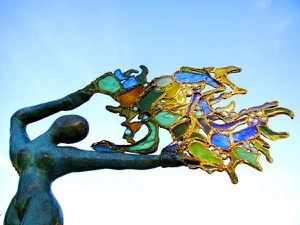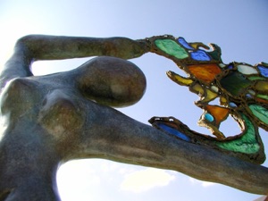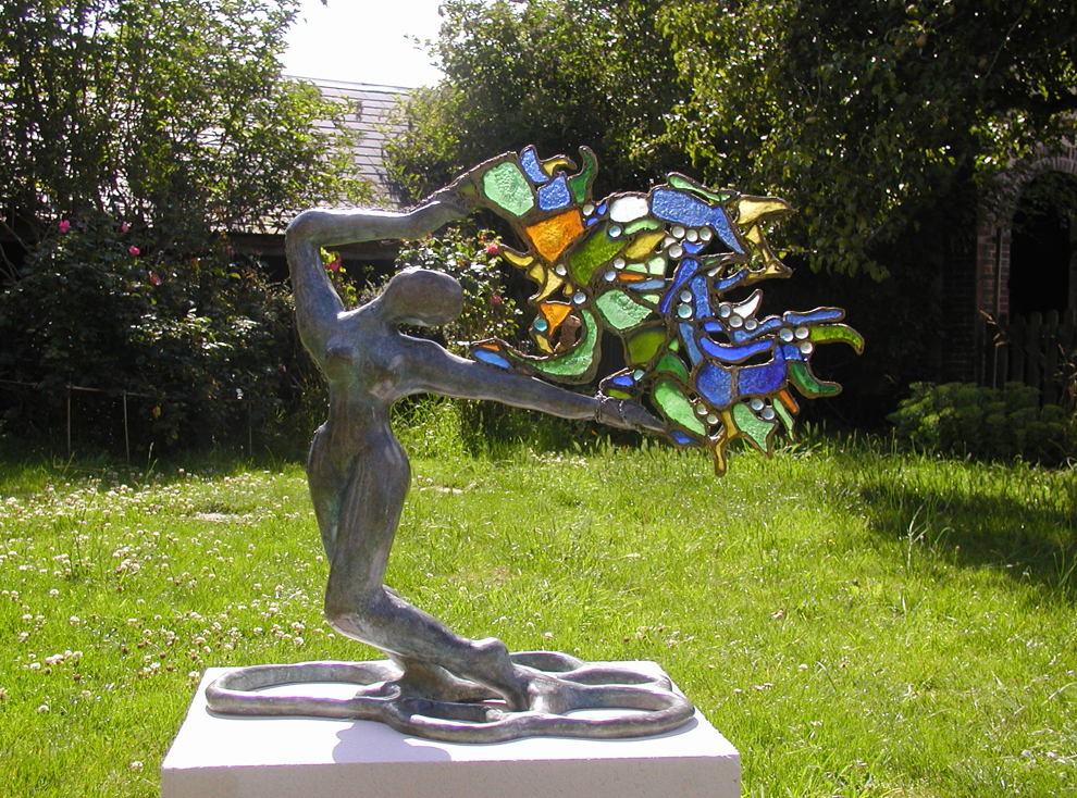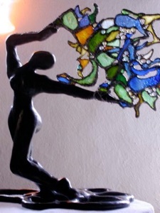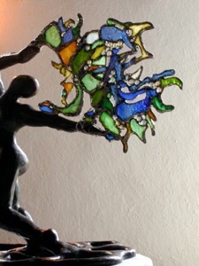 Bailarina universal de bronce que lleva la vida como un árbol de luz donde la fragilidad y la efímera se encuentran en un montón de espirales de energía transparente cristalizados por vidrios coloreados unidos por hilos de hierro y de plomo.
